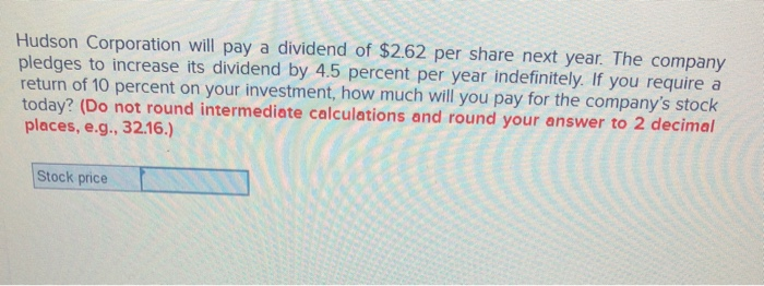 Solved Hudson Corporation Will Pay A Dividend Of 2 62 Per Chegg Com