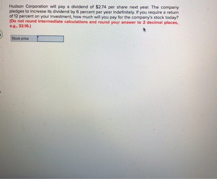 Solved Hudson Corporation Will Pay A Dividend Of 2 74 Per Chegg Com